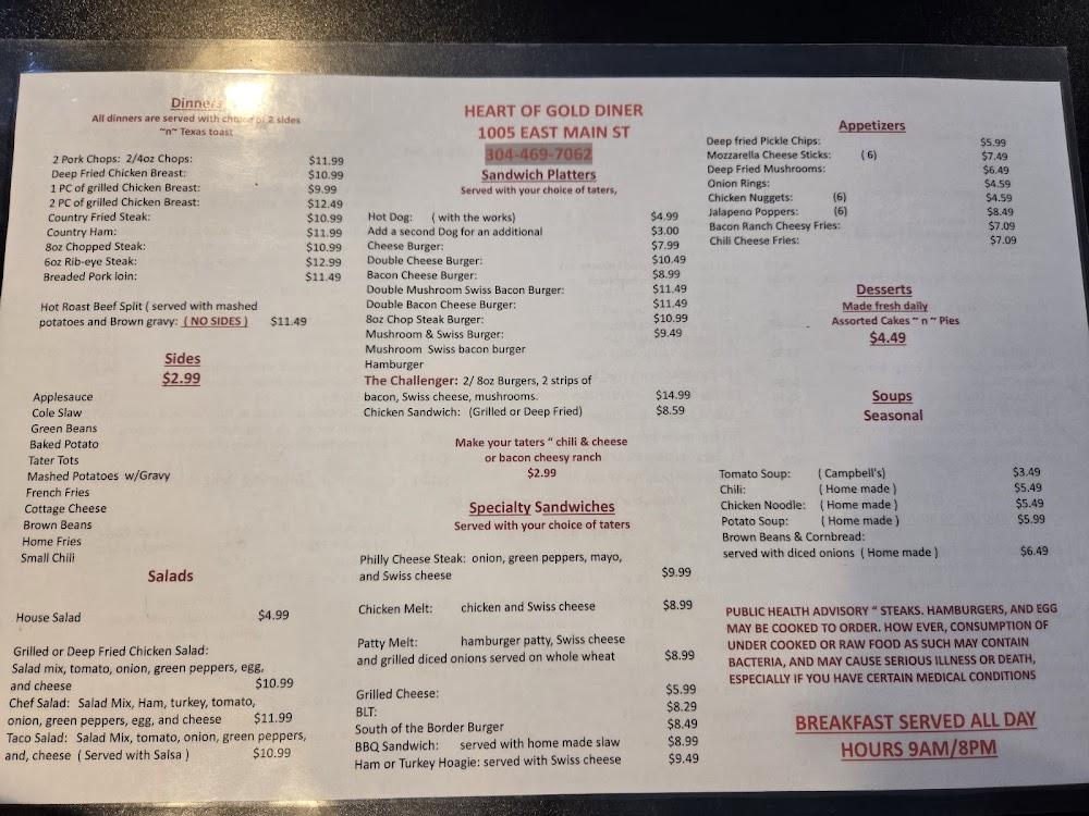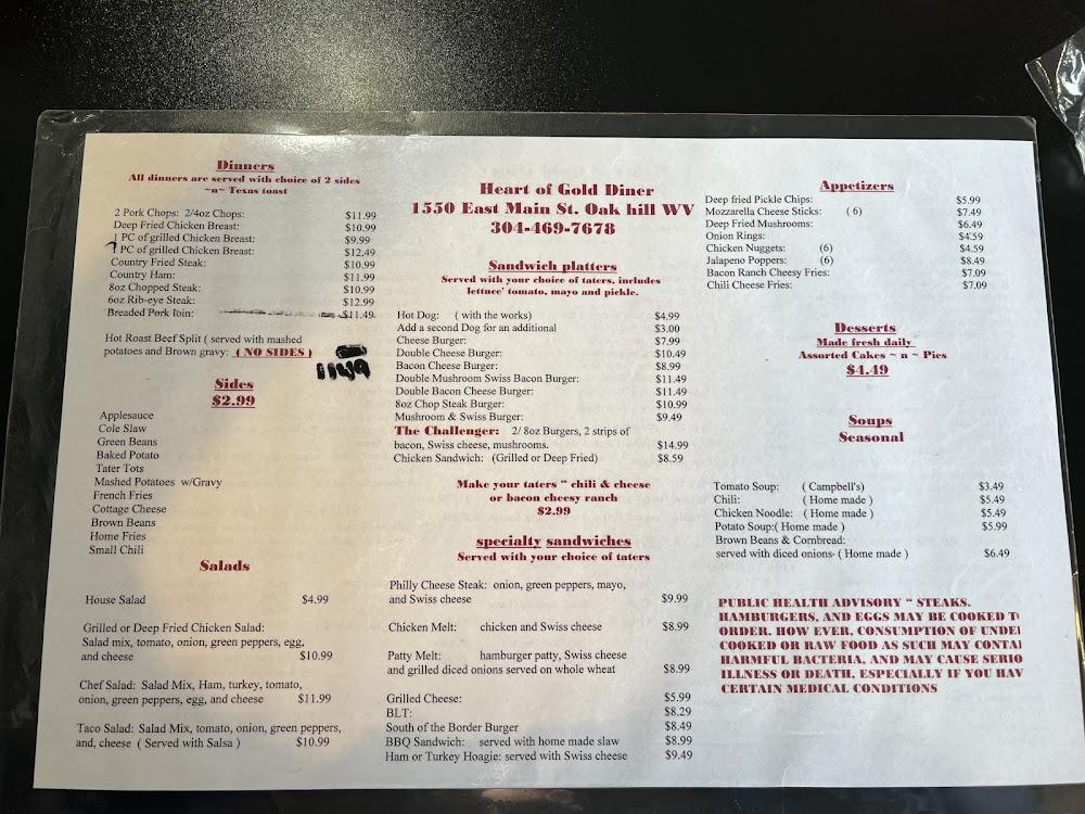 Welcome to Heart Of Gold Diner, your cozy neighborhood spot located at 1005 Main St E in Oak Hill, WV. Enjoy a delightful selection of traditional comfort food, including our famous breakfast, lunch, and dinner specials, all within a welcoming and relaxed atmosphere. Whether you’re dining solo or with friends and family, our menu features healthy options, shareable small plates, and delicious desserts. With wheelchair accessibility and ample parking, we strive to make your visit enjoyable. Join us for a cup of our excellent coffee or indulge in our local specialties. Reservations are accepted!